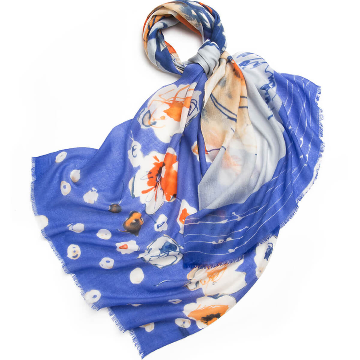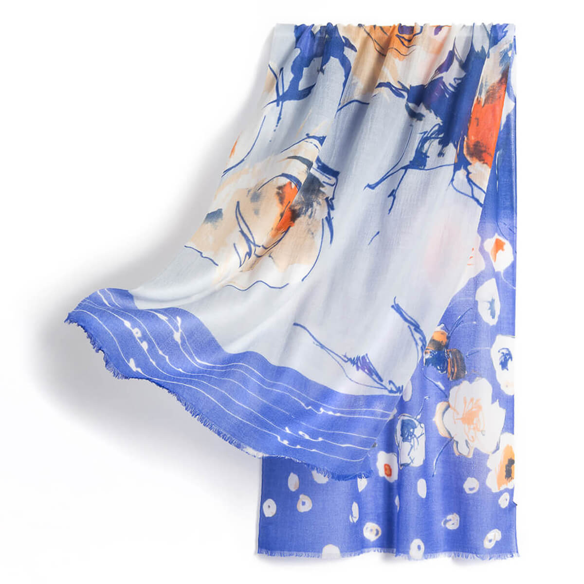 Leichter Schal aus 100er-Kaschmir mit blauem Aufdruck