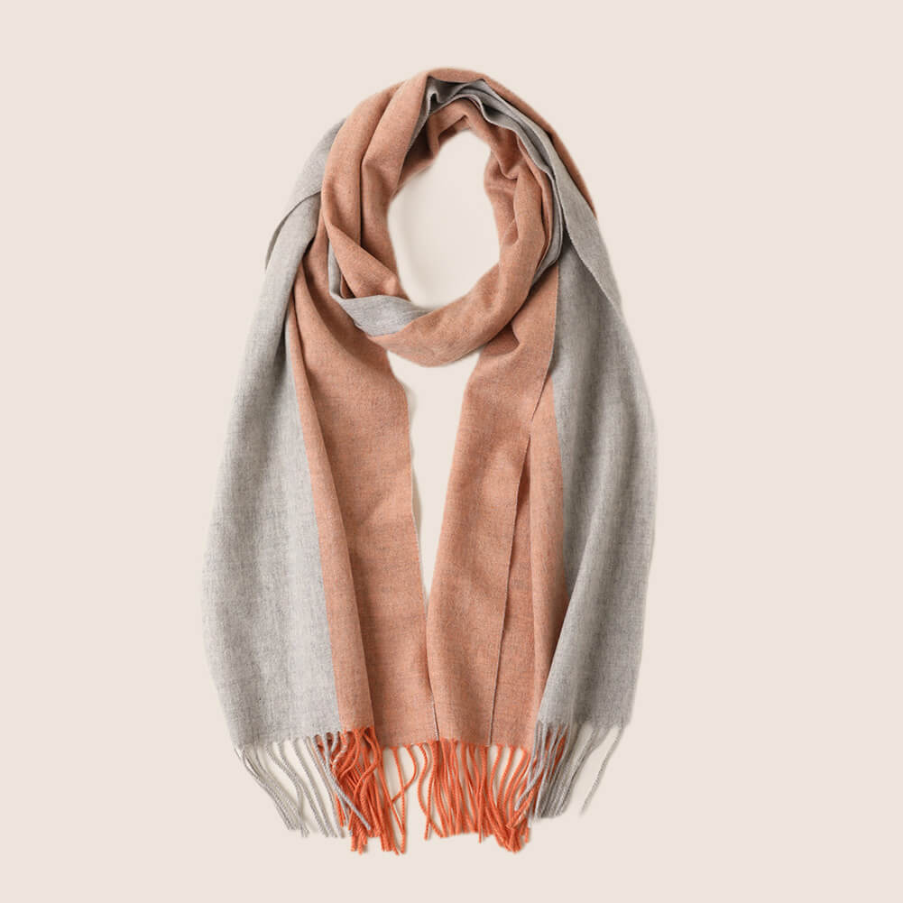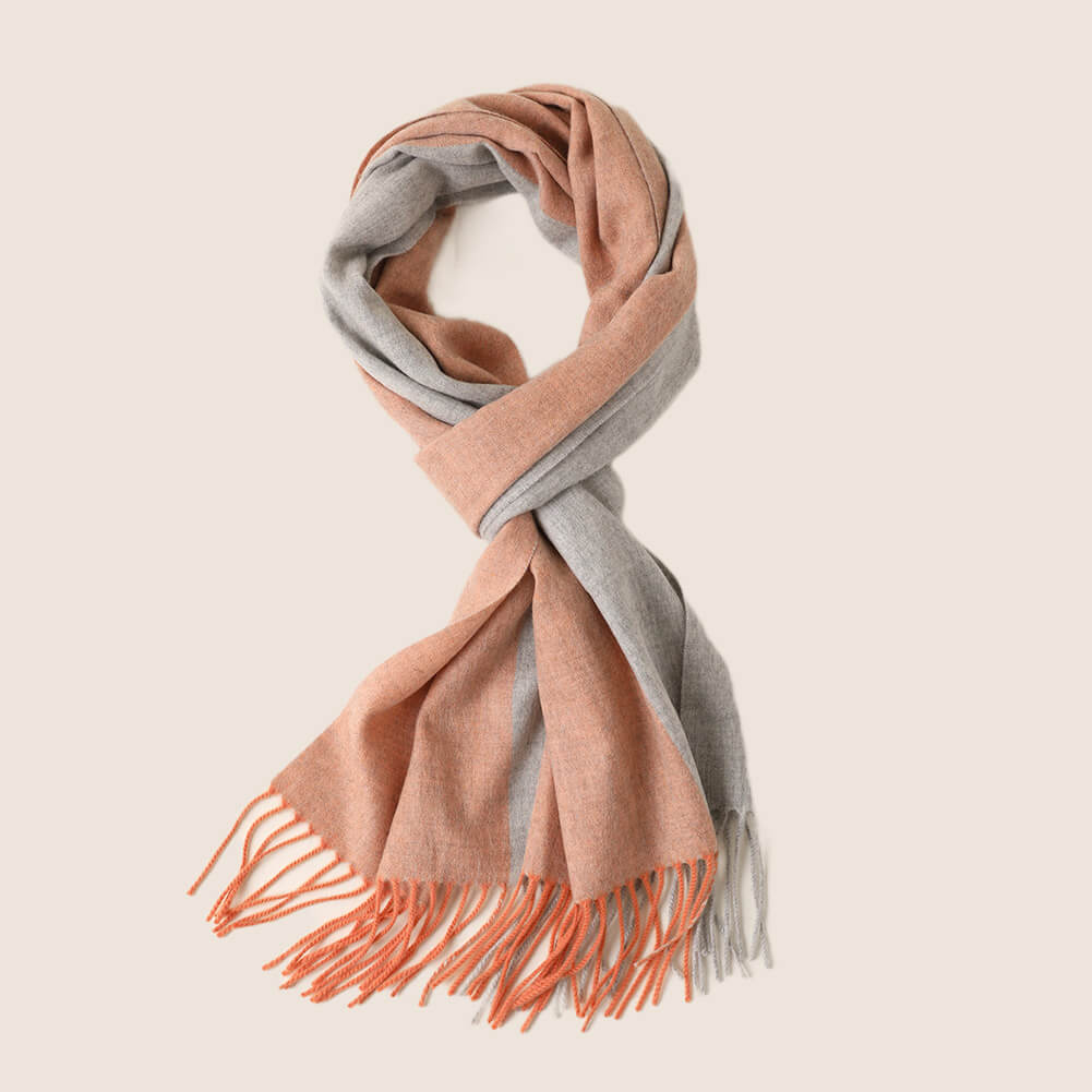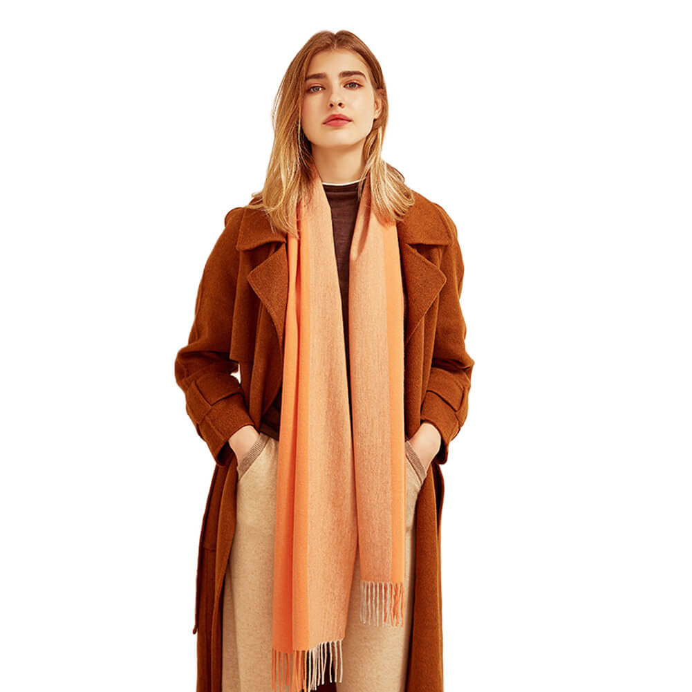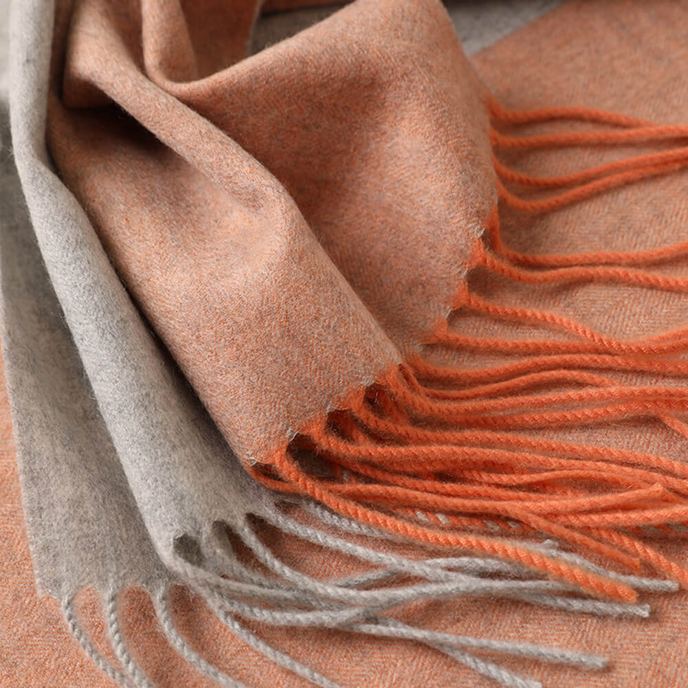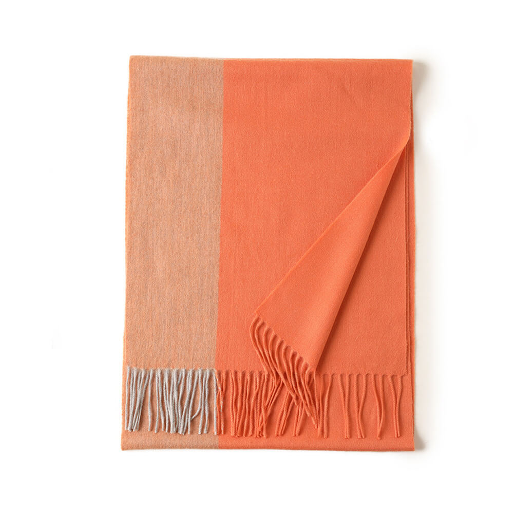 Esta bufanda de cachemira tiene un grosor medio y se puede usar en primavera, otoño e invierno. Está de moda y es fácil de mantener abrigado. Esta bufanda de cachemira está tejida con hilo peinado de cachemira. Se siente suave y delicado. Tiene un diseño de doble capa. La primera capa es de combinación de colores y la segunda capa es de un solo color. Los dos lados están coloreados juntos, el color es hermoso y el uso es más en capas.