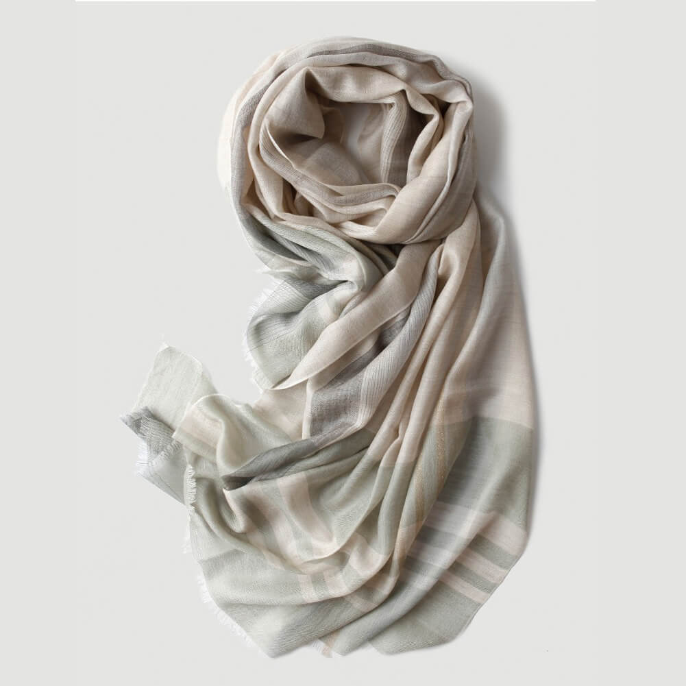 L'écharpe adopte un design à carreaux, trois jeux de couleurs, simples et atmosphériques, et il y a des bandes de couleurs qui sont très belles. L'écharpe est élégante, légère et respirante, douce et transparente, et peut être utilisée toute l'année.